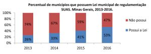 Em Minas, o percentual de crescimento do número de municípios que possuem lei de regulamentação do Suas saltou de 26%, em 2013, para 53% em 2016. É fundamental que todos os entes – União, Estados e Municípios – tenham o Suas regulamentado em seu âmbito, por tratar-se de um sistema descentralizado e participativo que prevê competências exclusivas e compartilhadas pelas três esferas de governo. Entre as metas do Pacto de Aprimoramento da Gestão está que 100% dos municípios possuam Lei atualizada que regulamenta a Assistência Social e o Suas.