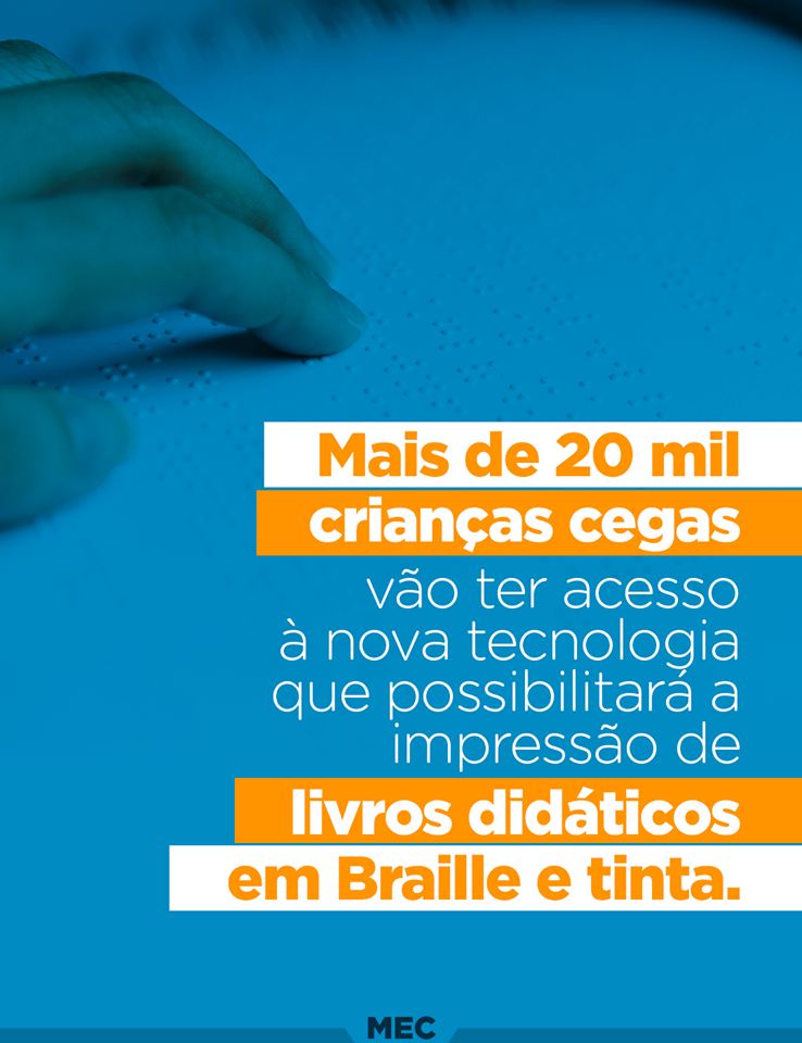 Mais de 20 mil crianças cegas do ensino fundamental de todo o país vão participar, em 2019, de um grande processo de inclusão, com a oportunidade de aprender o mesmo conteúdo paralelamente ao aprendizado das demais crianças. Uma nova tecnologia possibilitará a impressão dos livros didáticos em Braille e em tinta, algo inédito no Brasil. Os estudantes que se beneficiarão do material já estão recebendo os títulos nas escolas que indicaram a necessidade das obras.